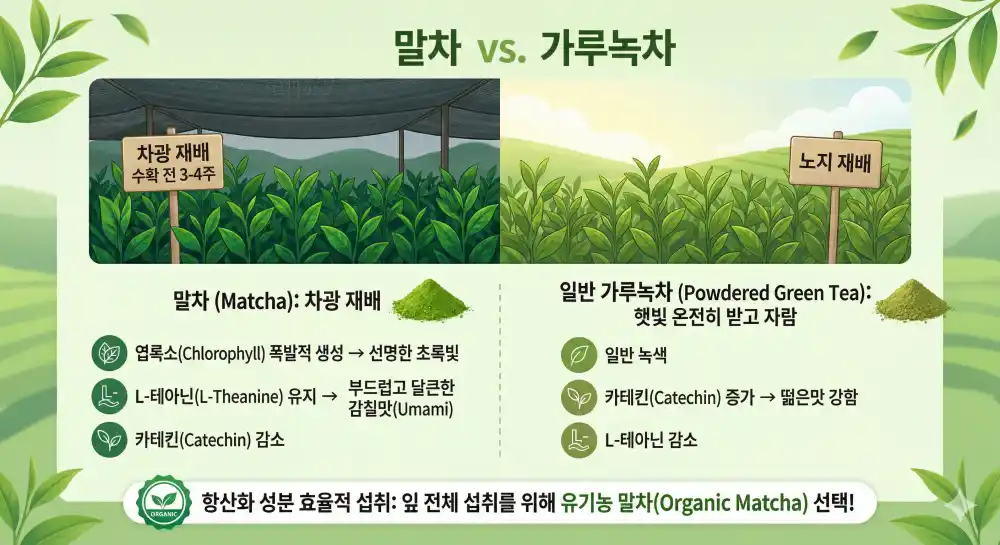 많은 분들이 놓치는 부분인데요, 일반적인 가루녹차와 말차의 결정적인 차이는 ‘차광 재배(Shading)’ 여부에 있습니다.